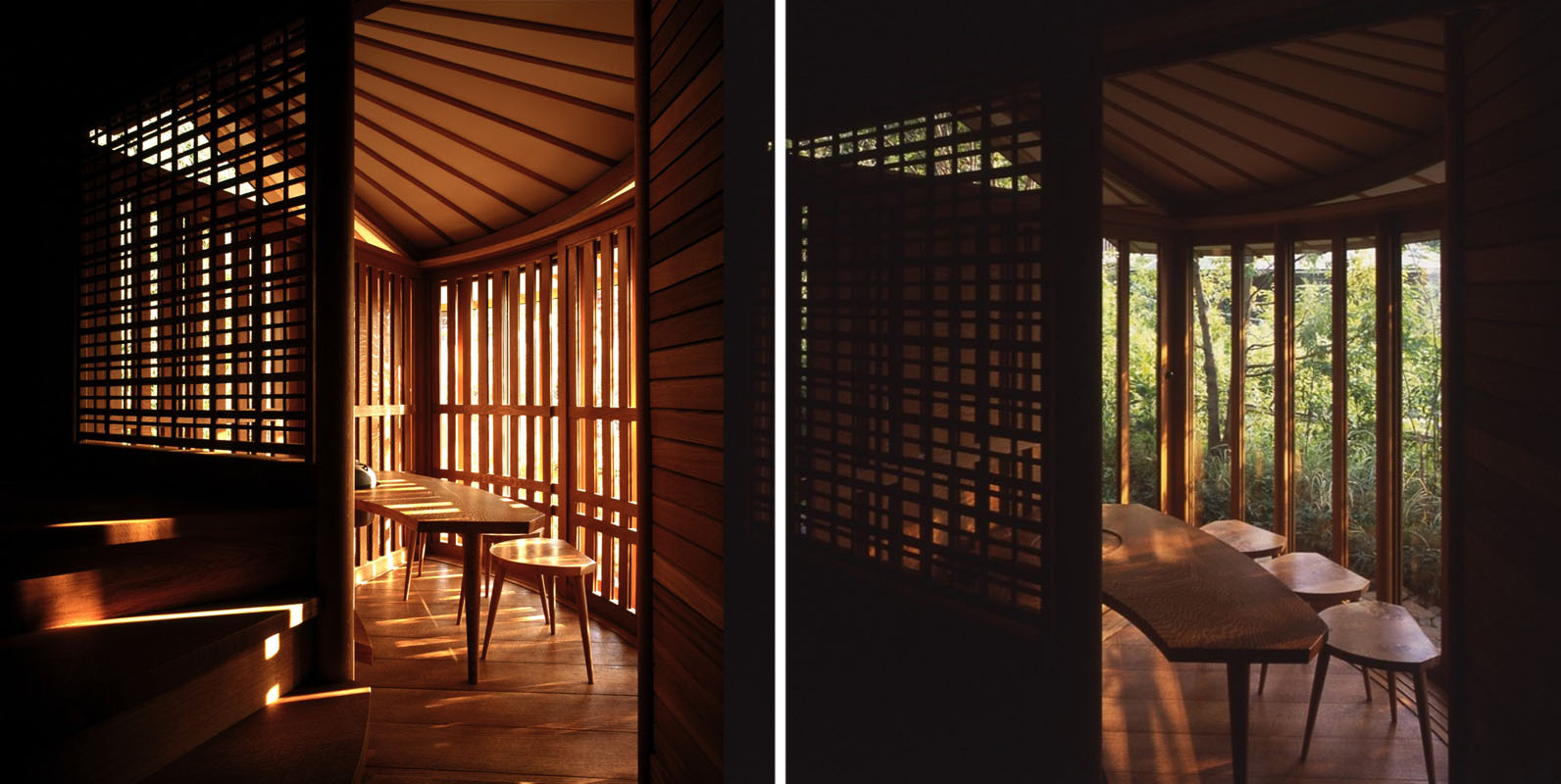 京都の風致地区・特別修景地域に位置する。ずっと以前からそこの一部であったような佇まいをもつ木の家の姿を求めた。樹齢300年のドイツのオーク材を建物の骨格からディテールの隅々にまで使用。音楽鑑賞を趣味としてきたクライアントの暮らし方を念頭に、家全体で音を響かせ、小さな音楽会ができるくらいの洗練された音響環境の中で生活する住空間をコンセプトとした。